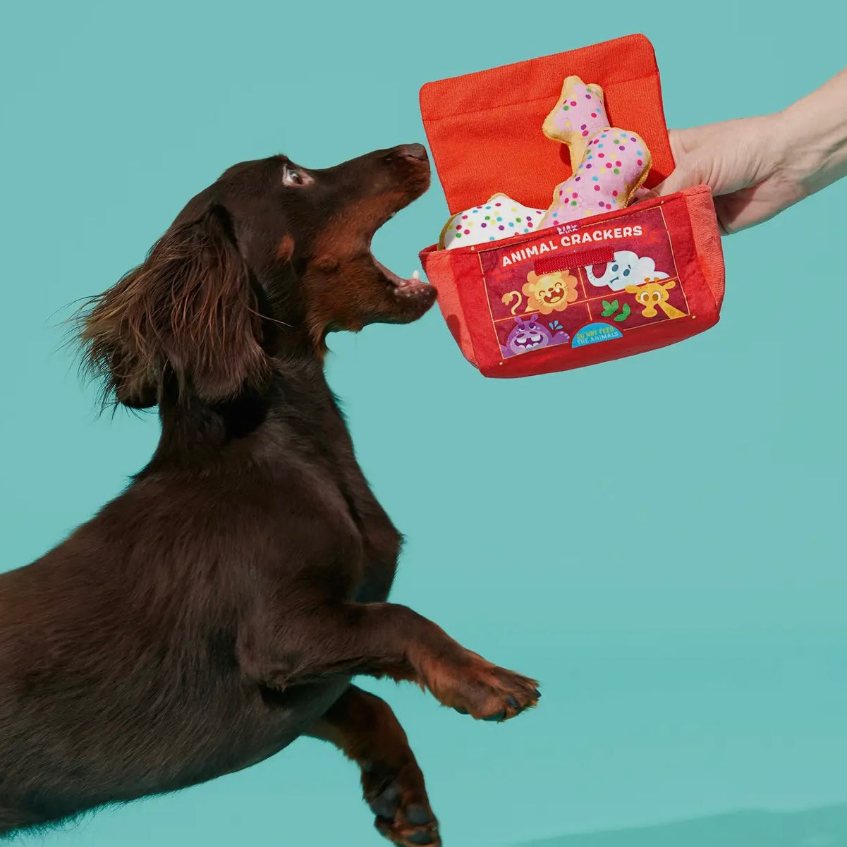 Your pup will love running wild with Animal Squeaker Snacks, a multi-part toy featuring three squeaky cookies in a crazy crinkle box. Whenever the zoo is empty, hide some treats inside for a post-play feeding frenzy!